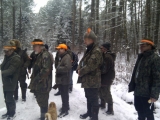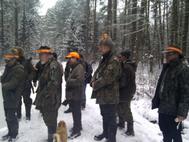 W pięknej zimowej scenerii 15 członków naszego koła zebrało się na zbiórce w leśnictwie Kamienisko. Odprawa, losowanie kartek i ruszyliśmy w stronę wilczego miotu. Kilka strzałów w miocie i jest pierwszy lis. W drugim miocie, "na góreczkach" pies wyprowadził watahę dzików na linię myśliwych. Kolega Adam strzelił pierwszego dzika a pozostałe z watahy wyszły na kolegę Bolka który ze względów bezpieczeństwa przepuścił cały "pociąg" nie niepokojąc go zupełnie. W miocie padł jeszcze jeden warchlak. Pozostałe mioty na Wiszczurach nie poprawiły wyników polowania, ale dodatkową atrakcją były łosie spacerujące wzdłuż linii myśliwych. Na zakończenie, przy pokocie Prezes podziękował członkom koła za dyscyplinę na polowaniach, omówił wyniki całego sezonu, i uhonorował kol. Andrzeja Mazepę statuetką dzika za zdobycie tytułu "Króla Polowań zbiorowych" sezonu 2011/2012